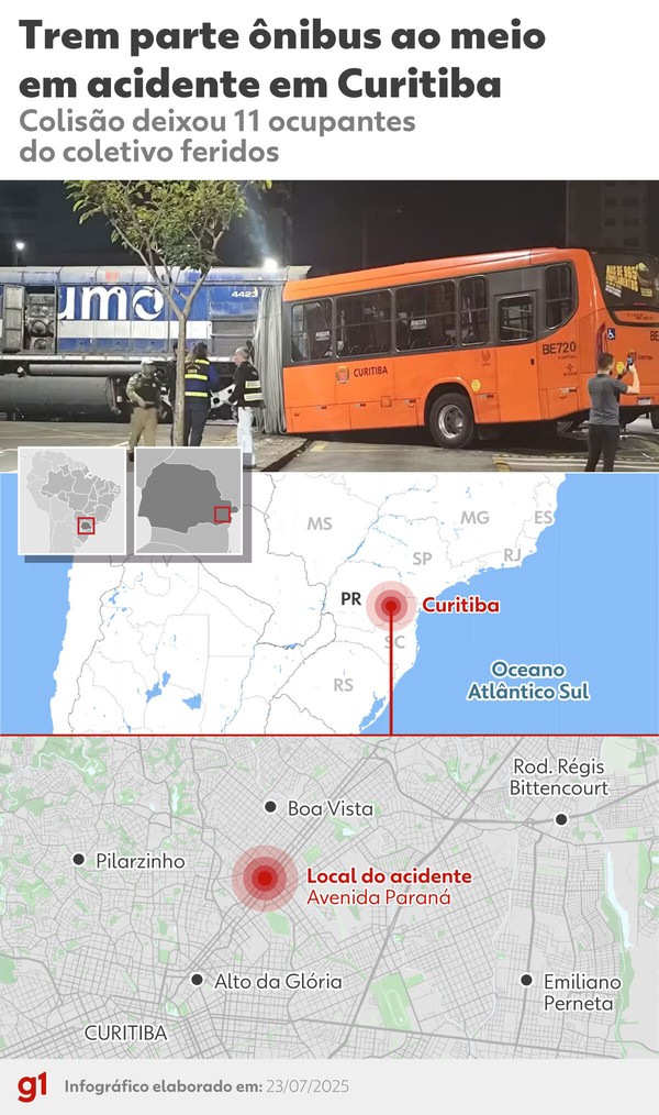 Ônibus biarticulado parte ao meio após ser atingido por trem em Curitiba; 11 ficam feridos